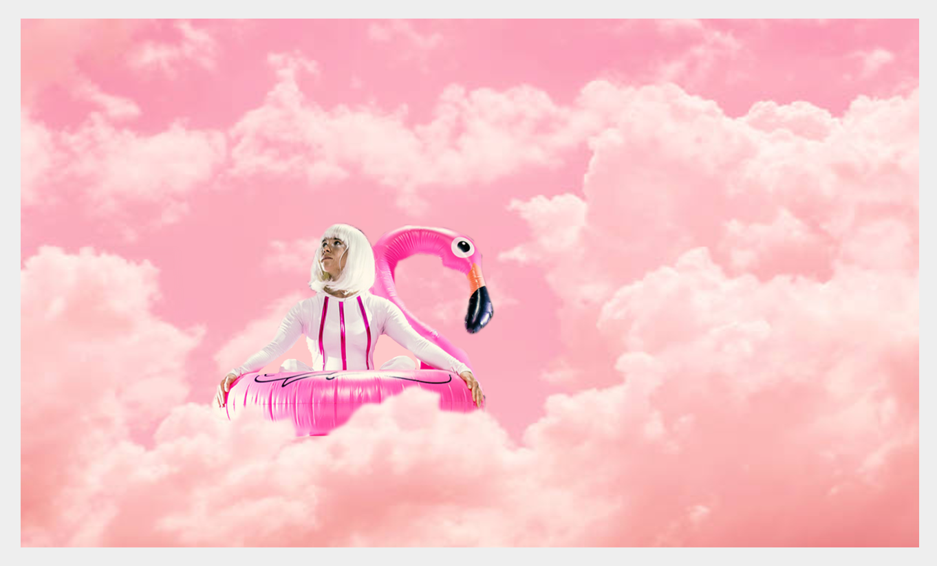 Ko smo se začeli pomikati proti svojim sediščem, je Romih že sedela sredi odra, pogreznjena v napol prazen rožnati obroč, evidentno smo jo ujeli med napihovanjem blazine v obliki flaminga. Oblečena je v belo-rožnat kostum, ki še najbolj spominja na rožnato power rangerko z belo sintetično lasuljo. Ko se gledalci posedemo, se luči malce zatemnijo, kar nam da signal, naj potihnemo. V tem trenutku se lahko zatopimo v svetleče rožnate oblačke, ki so projicirani v ozadje odra in v kombinaciji z izgledom performerke ustvarjajo alternativen svet pinky atmosfere, eteričnega vzdušja in polivinilklorida. Vzdušje lebdenja v nadzemskem svetu lahkotnosti še podkrepljuje umirjena zvočna podlaga počasnih ritmov. Vse nas nagovarja k temu, da se sprostimo. Ko plesalka svojega odrskega partnerja napolni z izdihanim zrakom, se z nasmeškom obrne proti občinstvu, nakar zaslišimo glas izjemno artikulirane performerke, ki okuša vsak fonem posebej. Povabi nas, da zapremo oči in se ji pridružimo v sproščanju: Vdihnite in izdihnite. Vdihnite igrivost in izdihnite tegobe, od danes, od gneče na cesti, od politike, od pred parih let. Idiosinkrazija igralkinega glasu do predstavljenega vizualnega materiala v gledalcih hitro vzpostavi ironično distanco, češ: vem, da izgleda kot konvencionalne dihalne vaje, ampak vztrajajmo še malo.