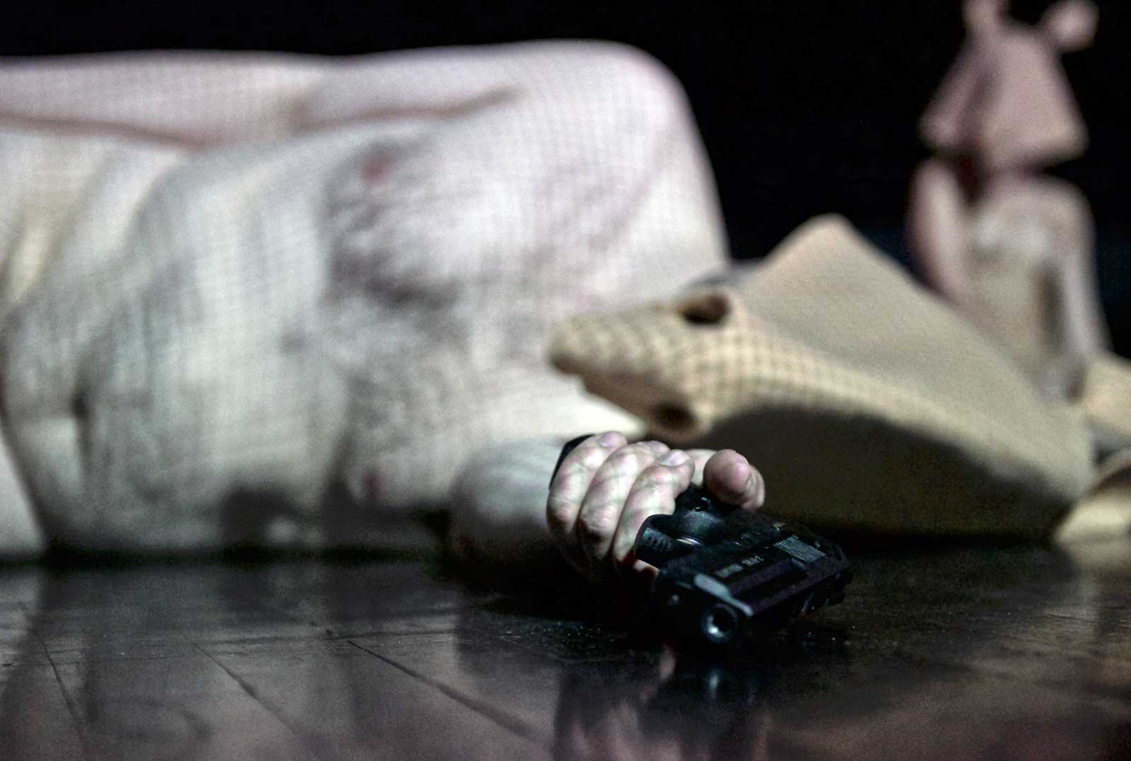 Biopolitična, razdružbljena in obupna razsežnost stvarnosti je podčrtana še z drugimi izraznimi sredstvi: s skupinskim nalivanjem čaja v skodelico; z multiplikacijo akcije, ko posamezno dejanje izvajajo vsa telesa; s poki pištol, gesto, ki jo sicer postavijo pod vprašaj ušesni čepki, ki jih dobimo gledalci, vendar k sreči v kontekstu, ki je postopkovno drugačen kot v nedavnem primeru Frljićeve predstave Naše nasilje in vaše nasilje.