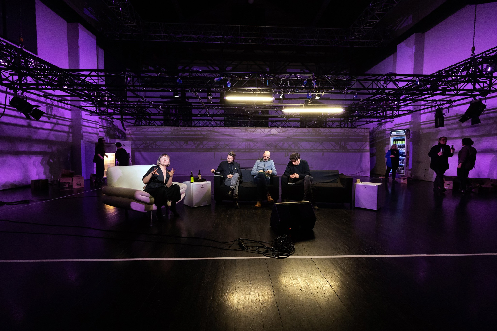 Po končanem predavanju, nekakšni teoretski uglasitvi za nadaljnje dogajanje, se prične dvigovati platno in tukaj prvič eksplicitno uvidimo performativni značaj dogodka. Skupina žensk, ekipa sodelavk Bunkerja, na oder začne uigrano prinašati sedežne garniture in hladilnike s pivom, ki ga bodo v naslednjih dveh urah skupaj s pico delile publiki. Nato se na oder spusti ogrodje z reflektorji, ki omeji prostor in skupaj z novo, rahlo vijolično osvetlitvijo ustvari intimno atmosfero. Vstopili smo v drugi del simpozija – pogovor s tremi evropskimi, heteroseksualnimi, cis moškimi ustvarjalci uprizoritvenih umetnosti.