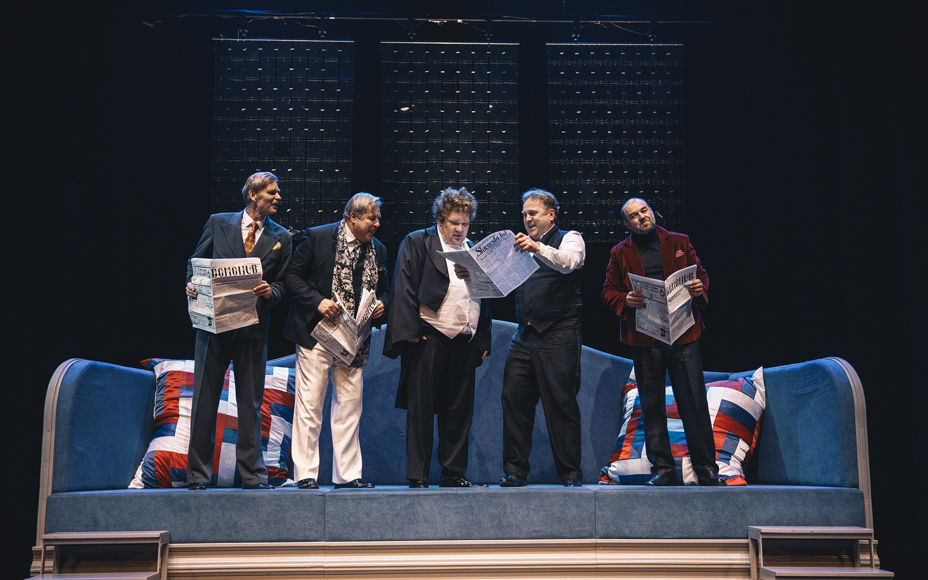 Potem se platno s skico dvigne, plesalke se porazgubijo, na odru pa zagledamo modro zofo nadnaravne velikosti, ki je z obliko naslonjala nemara aluzija na Triglav ali pa na psihoanalitični kavč, na kateri se drenja in sprehaja cel kup blagorodnih meščanov in meščank, ki bi vsi po malem potrebovali kako uro ali dve terapije. Na velikanski zofi pa so tudi velikanski vzglavniki, katerih menjavanje nakazuje spremembo kraja dogajanja. Tako so pri veljaku Grozdu, igra ga Lotos Vincenc Šparovec, potiskani z mini slovensko trobojnico, pri njegovem tekmecu Grudnu, igra Uroš Smolej, pa so obarvani v kapitalistično zlato. Vsak od njiju ves čas sprejema fine goste, ki se najprej slinijo k enemu, naslednji hip pa že drugemu. Zupančič je to skupinico malomeščanov prikazal kot šminkersko in malo omejeno, kar je še razumljivo, vprašljiva pa je odločitev, da je vse skupaj zavito v neko stereotipno homoseksualno podobo, kar se odraža v drži, kretnjah in načinu govora. Ženske ostajajo le v funkciji žena in poskušajo prekašati druga drugo v tem, katera bo večja diva; to je podprto tudi z bleščečimi kostumi Bjanke Adžić Ursulov, primernimi za podelitev kakšnih filmskih nagrad.