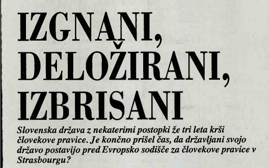 Slovenska država z nekaterimi postopki že tri leta krši človekove pravice. Je končno prišel čas, da državljani svojo državo postavijo pred Evropsko sodišče za človekove pravice v Strasbourgu? Razpravljanje o tem, ali se v Sloveniji človekove pravice kršijo zgolj v posameznih primerih ali »sistematično«, je za nekaj sto tistih, ki jih je slovenska država v zadnjih treh letih izgnala, deložirala, jim odvzela pokojnine, državljanstvo, stanovanja, zdravstveno in socialno zavarovanje ali jih preprosto »izbrisala« iz registra stalnih prebivalcev, zgolj akademsko čenčanje. Njihove zgodbe, zapisane v kupih sivih dosjejev, ki se že tri leta prekladajo po prašnih predalih od Sveta za varstvo človekovih pravic in temeljnih svoboščin ter različnih parlamentarnih komisij do zdolgočasenih uradnikov Voxa, predsednika republike in vlade, HKS in Helsinškega monitorja ter državnega varuha človekovih pravic, očitno ne zanimajo nikogar. Toda za predstavnico Helsinškega monitorja Nevo Miklavčič Predan so stvari kristalno jasne. »Seveda gre za sistematične kršitve, saj se izvajajo na podlagi zakonov in odlokov. To pa je vendarle sistem, ali ne?«