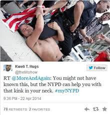 To pravljico je skušal prodajati tudi policijski oddelek iz New Yorka, ki je na Twitterju izdal poziv, naj državljani pošiljajo slike njihovih policistov s pripisom #myNYPD. Želeli so seveda slike belskega in črnskega policista, ki pomagata čez cesto stari azijski invalidki. A dobili so množico slik policijskega nasilja in obtožb rasizma iz vstaj Occupy Wall Street in vsakdanjega newyorškega življenja.