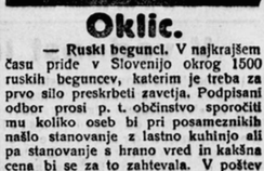 S težavami, povezanimi z njihovo namestitvijo, pa so se na Slovenskem ukvarjali tudi pred slabim stoletjem, ko so pričakovali ruske begunce. Če se danes z namestitvijo prosilcev za azil po uradni dolžnosti in z veliko mero dvoličnosti ukvarjajo oblasti ob pomoči humanitarnih organizacij in posameznikov, pa je k sprejetju sonarodnjakov v Sloveniji leta 1920 pozival “Ruski krožek.” Zanj je 24. februarja Terezina Mihajlovna Jenko v Slovenskem narodu (str. 4) objavila naslednji “Oklic.”
