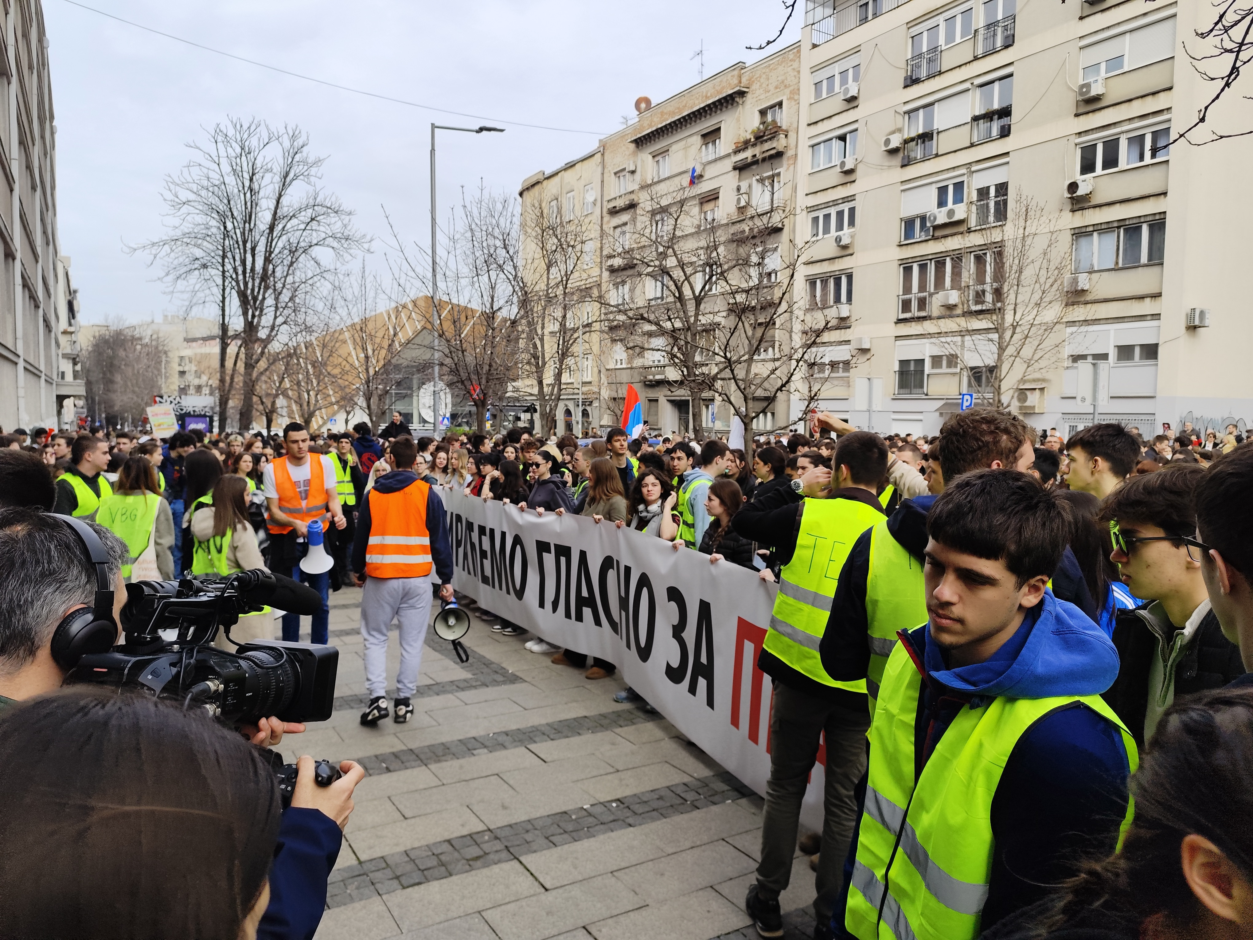 Mašinci iz blokirane zgradbe fakultete, ki jo s kavo na brkih in cigaretnim dimom med obrvmi potrpežljivo opazujemo iz kafane s pomenljivim imenom čez cesto, izstopijo ob pol dvanajstih. Z vse glasnejšim žvižganjem, tuljenjem in splošnim pumpanjem odrinejo na mesto, kjer bodo počastili spomin na umrle ob padcu nadstreška novosadske glavne železniške postaje. Križišče, ki so ga ob točno 11:52 študentje, dijaki in ostali blokirali danes, se je v zadnje pol ure pred tišino trikrat zamenjalo. Naposled so plenumi odločili, da ustavijo promet pred Peto beograjsko gimnazijo, ker jo je sveža vršilka dolžnosti ravnateljice zjutraj okupirala - hišnik je zaklenil vsa vrata, do nadaljnega na gimnazijo ne sme vstopiti ne dijakinja, ne profesor.