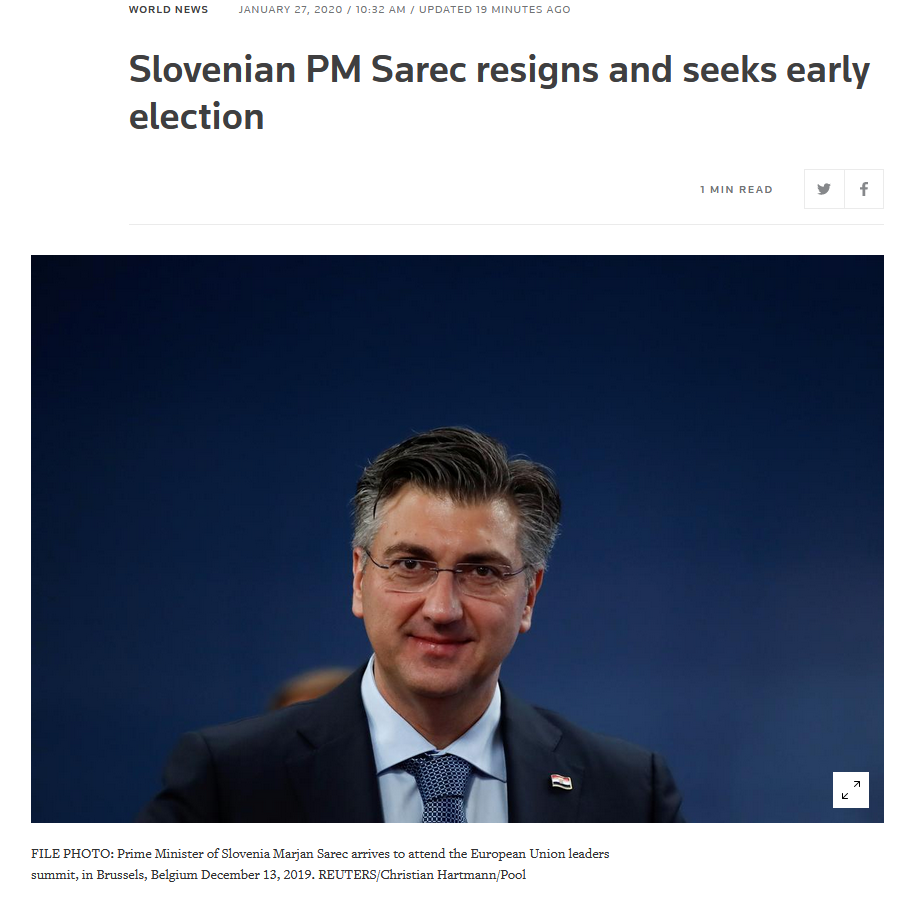 Predsednik vlade Marjan Šarec je danes nepričakovano odstopil s položaja. Šarčev sloves je sledil odstopni izjavi finančnega ministra Andreja Bertonclja, čigar razlog za to potezo naj bi bila strokovna razhajanja pri uvedbi ukinitve dopolnilnega zdravstvenega zavarovanja. Premier Šarec je sicer povedal, da nesoglasje med ministroma Šabedrom in Bertoncljem ni vplivalo na odločitev o odstopu. Kot je dejal, se je za odstop odločil, ker meni, da so nove volitve edina rešitev, saj vlada ni uspela zbrati dovolj podpore za svoje reformne projekte. Premier pričakuje razpis predčasnih volitev, v kar pa niso prepričani vsi predsedniki strank, v prvi vrsti predsednik SMC Zdravko Počivalšek. Možnosti za sestavljanje nove koalicije v obstoječem sklicu Državnega zbora vidita tudi Alenka Bratušek in Zmago Jelinčič. Za nove volitve se zavzemajo v Novi Sloveniji, SDS-u, SD-ju in Levici. Več v OFFsajdu ob 17.00.