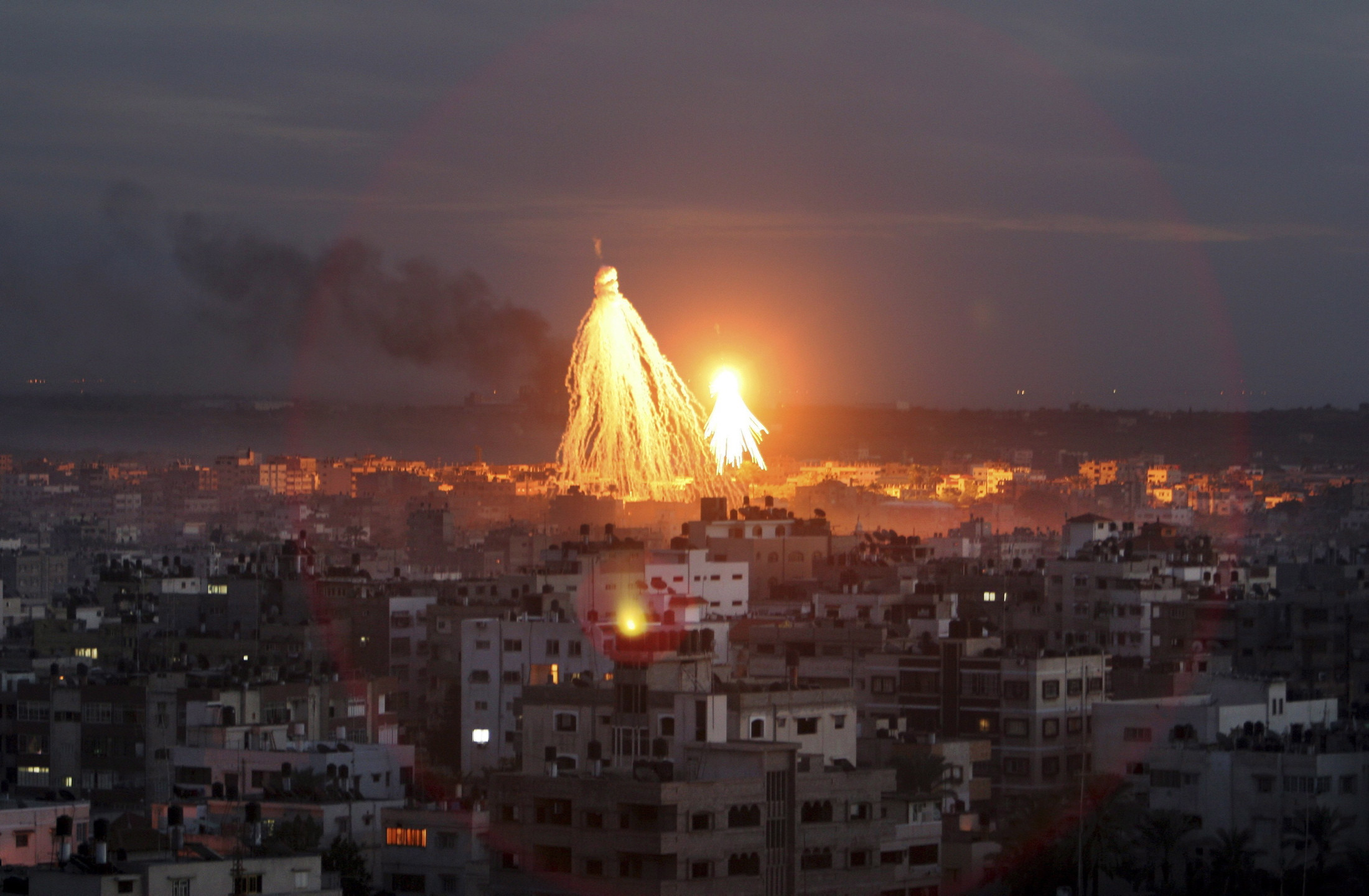 Vojaška ofenziva Izraela na območje Gaze zahteva vse več žrtev. V zadnjih dveh tednih raketnega obstreljevanja naj bi po navedbah palestinskega ministrstva za zdravje padlo 583 Palestincev, več kot 3000 pa je bilo ranjenih. Na drugi strani Izrael po poročanjih beleži 27 smrtnih žrtev. Pomembno je opozoriti na hudo humanitarno krizo zaradi prebegov iz napadenih območij. Po podatkih Agencije Združenih narodov za palestinske begunce je število brezdomnih Palestincev od začetka ofenzive naraslo na 100.000, kar je dvakrat več kot v zadnji ofenzivi leta 2009. Izraelska ofenziva sicer dobiva vse bolj grozljivo podobo, o čemer priča tudi še neuraden podatek o uporabi raket belega fosoforja nad ulicami Gaze. Uporaba tega orožja na območjih s civilnim prebivalstvom je zaradi visoke smrtnosti po konvencijah Združenih narodov prepovedana, kljub temu pa njihova uporaba za Izrael ne bi bila nič presenetljivega, saj se jih je ta posluževal že v ofenzivi leta 2009.
