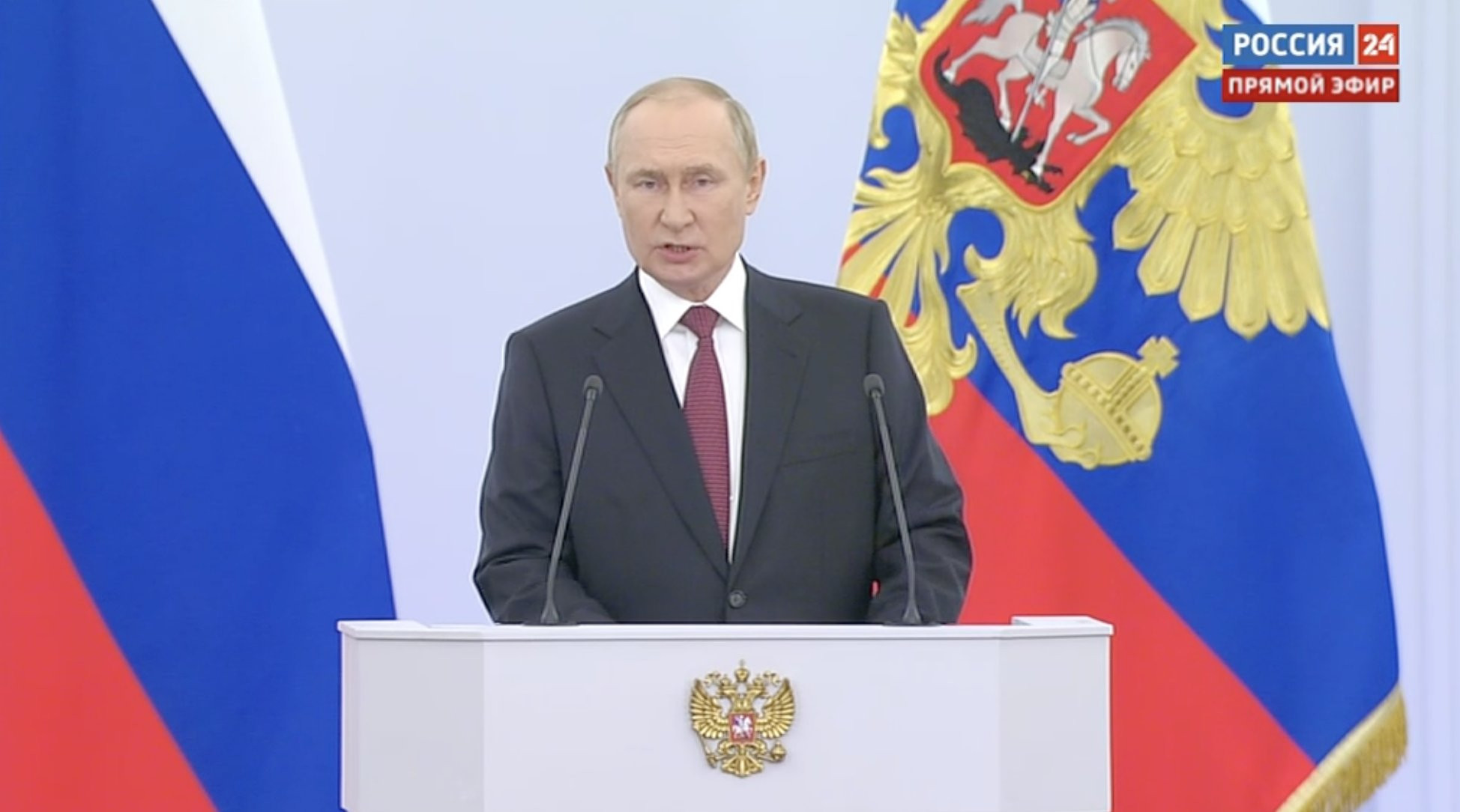 Ruski predsednik Vladimir Putin je podpisal odloka, s katerima Rusija priznava državno suverenost in neodvisnost ukrajinskih regij Zaporožje in Herson. Ravno zdaj v Kremlju poteka dogodek, na katerem Putin podpisuje sporazum o priključitvi štirih ukrajinskih regij Ruski federaciji: to so Zaporožje, Herson ter samooklicani ljudski republiki Doneck in Lugansk, neodvisnost katerih je uradna Moskva priznala pred začetkom invazije. Priključitev spremlja slovesnost na Rdečem trgu. Tiskovni predstavnik Kremlja Dmitrij Peskov je še pred Putinovim podpisom izjavil, da bo morebiten napad na katerokoli priključeno regijo Rusija razumela kot napad nanjo. Braniti naj bi jih bila pripravljena tudi z uporabo jedrskega orožja. Referendumov, ki so jih proruske separatistične oblasti v omenjenih regijah na jugu in vzhodu Ukrajine izvedle med minulim petkom in torkom, mednarodna skupnost ne priznava. Generalni sekretar Združenih narodov António Gutteres je opozoril, da vsakršna priključitev ozemlja druge države na podlagi uporabe sile krši tako Ustanovno listino Združenih narodov kot mednarodno pravo. Zaporožje, Herson, Doneck in Lugansk, ki tvorita širše območje Donbasa, skupaj s polotokom Krim, ki ga je Rusija priključila leta 2014, predstavljajo 90 tisoč kvadratnih kilometrov oziroma petino celotnega ukrajinskega ozemlja, kar je – za primerjavo – toliko, kot je velika Madžarska.
