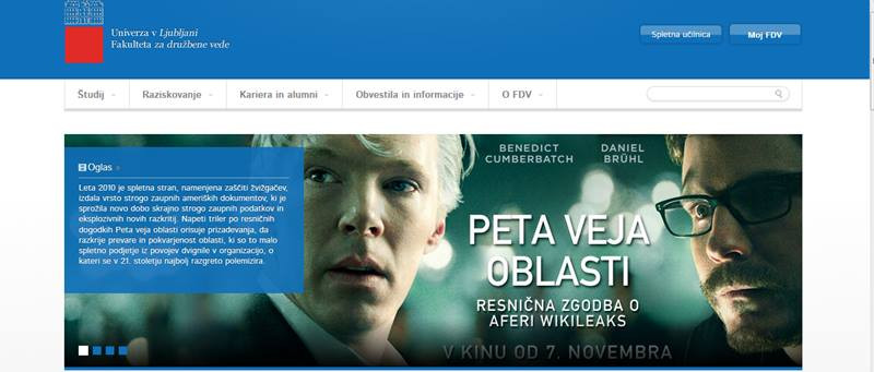 Po jumbo plakatu, ki je med obnovo fasade krasil Filozofsko fakulteto in študente vabil k nakupovanju modnih oblačil, je zdaj v polje oglaševanja zaorala še ena fakulteta, kjer naj bi se domnevno gojilo kritično mišljenje. Gre za Fakulteto za družbene vede, na katere spletni strani nas pozdravi velika reklama za film o Wikileaksu, ki bo na sporedu v dvoranah največjega distributerja filmov na Slovenskem. Domnevna aktualnost teme filma ni nikakršno opravičilo za prodajanje oglasnega prostora za komercialne namene, je pa res, da je najbrž to šele začetek, saj FDV strašno inovativno ponuja tudi sponzoriranje in s tem poimenovanje predavalnic, za primeren denar pa proda tudi svoj adresar elektronskih naslovov študentov.