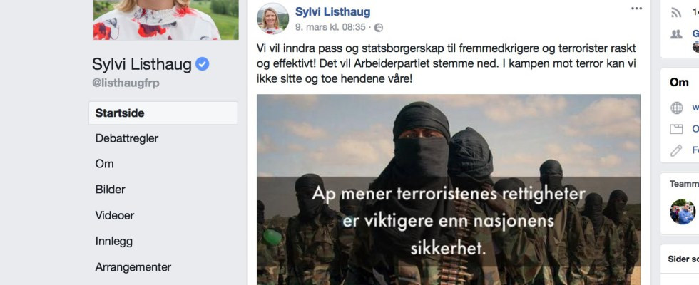 Ministrica za pravosodje Silvi Listhaug je odstopila, potem ko so vse opozicijske stranke zahtevale njen odstop zaradi sedaj izbrisanega sporočila na Facebooku. Tam je Listhaug napisala, da Delavska stranka bolj skrbi za pravice teroristov kot pa za varnost v državi. Izjava se je nanašala na to, da je Delavska stranka glasovala proti zakonu, po katerem bi lahko država brez dokazov odvzela državljanstvo vsem, ki jih je dolžila terorizma ali bojevanja v tujih vojaških skupinah.