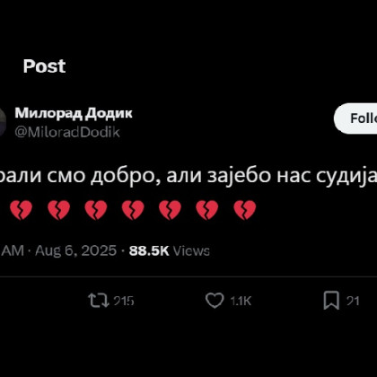 Ustavno sodišče Bosne in Hercegovine je zavrnilo pritožbo nekdanjega predsednika entitete Republike Srbske Milorada Dodika na odločitev državne volilne komisije, ki mu je odvzela mandat. Dodikovi odvetniki so v tožbi trdili, da mu ni bilo omogočeno pravično sojenje, kar je sodišče ovrglo. Volilna komisija je odločitev sprejela avgusta, potem ko je prizivno sodišče potrdilo Dodikovo obsodbo na enoletno zaporno kazen in šestletno prepoved političnega delovanja zaradi neupoštevanja odločitev visokega predstavnika mednarodne skupnosti Christiana Schmidta. Sodišče BiH je nato ugodilo Dodikovi zahtevi po zamenjavi zaporne kazni z denarno. Dodik je za zamenjavo kazni plačal več kot 36 tisoč konvertibilnih mark, kar je okoli 18 tisoč evrov. Volitve za novega predsednika entitete bodo potekale 23. novembra, položaj vršilke dolžnosti predsednice do volitev zaseda nekdanjega Dodikova svetovalka Ana Tršić Babić.