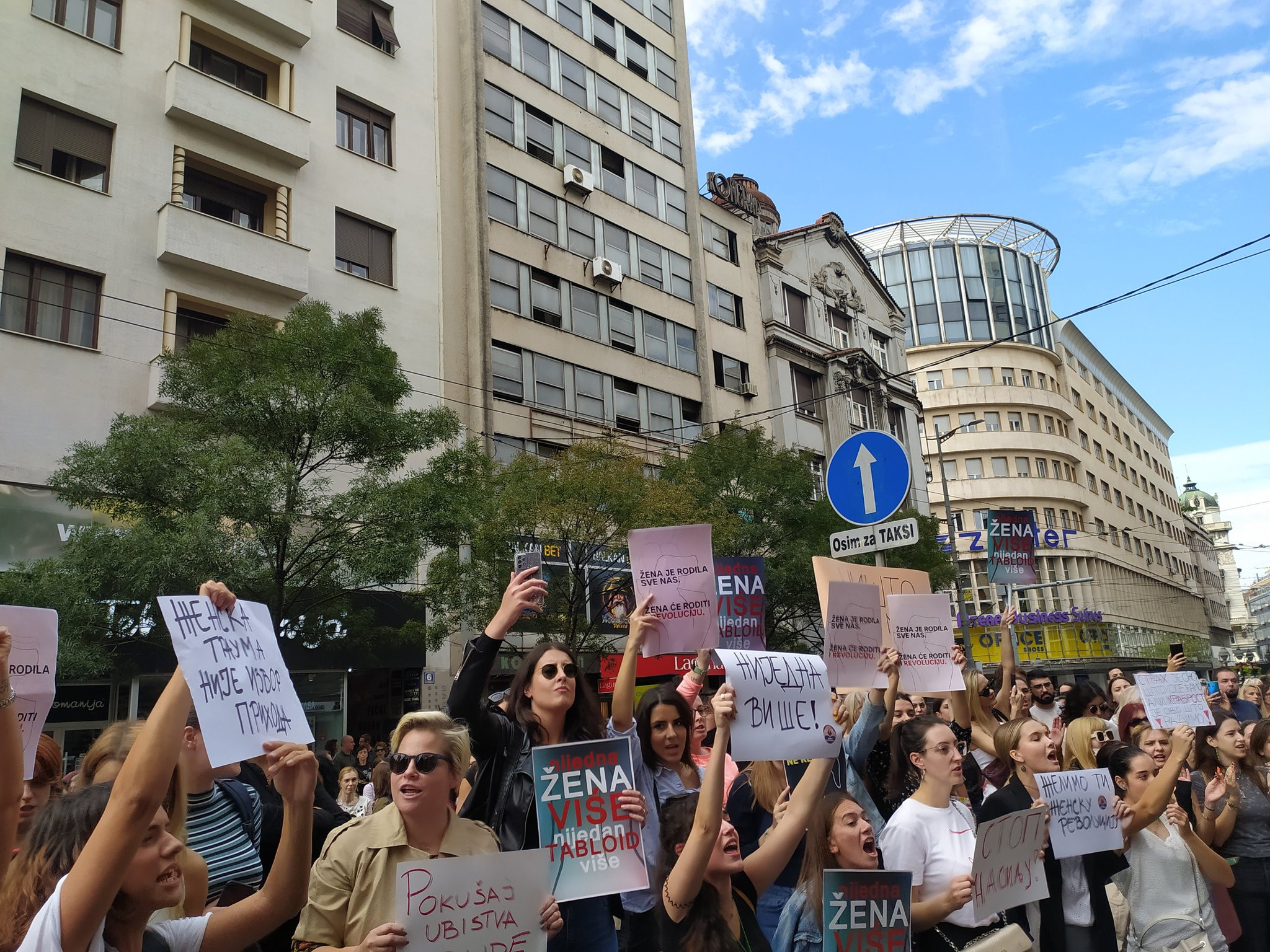Protestnice so se zbrale pred stavbo tabloida, vanjo so domnevno metale tudi jajca. Protesti so se zaostrili, ko je ena od protestnic brcnila proti lastniku in glavnemu uredniku tabloida Draganu J. Vučićeviću. Na Informerju so se zlagali, da je urednik utrpel udarec v glavo, čeprav je s posnetka jasno razvidno, da ga je komaj uspela brcniti v nogo. Protesti so bili sicer med bolje obiskanimi protesti za pravice žensk v Srbiji.