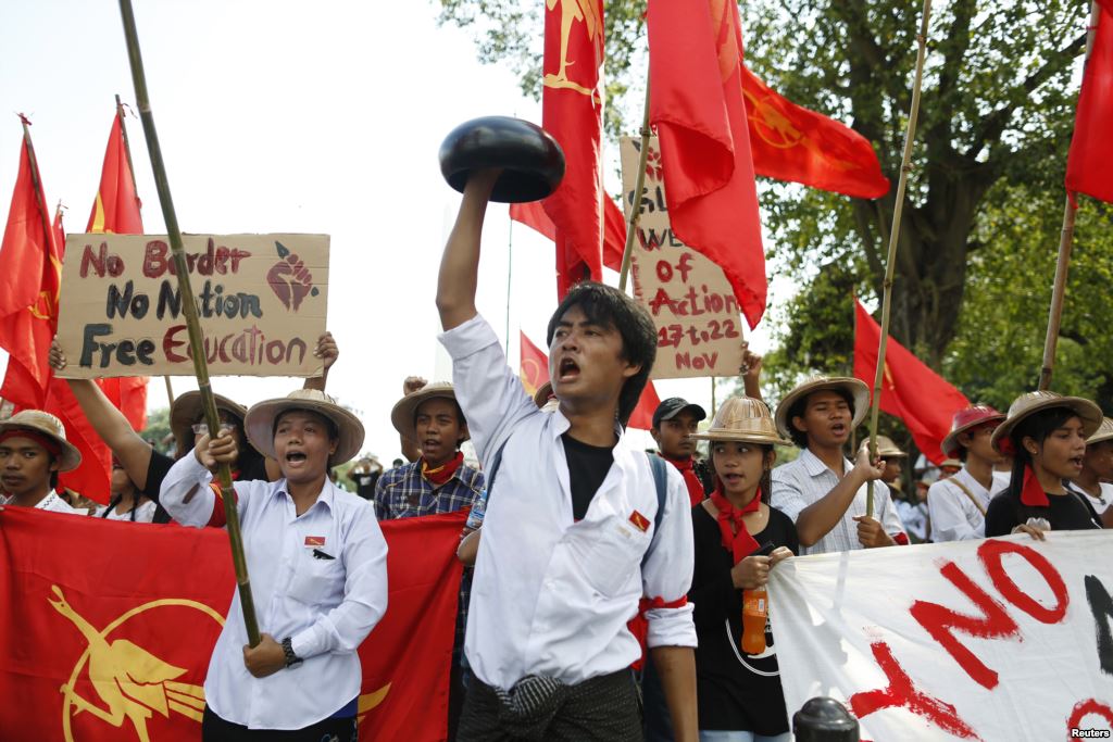 Nekoliko vzhodneje, v Mjanmaru, so včeraj potekali spopadi med študenti in policijo. Mjanmarski študenti se še vedno skupaj s profesorji in budističnimi menihi borijo proti septembra sprejetemu zakonu o izobraževanju. Ta namreč določa, da o izobraževalnih programih in njihovi vsebini namesto strokovnih odborov odloča le nekaj vladnih ministrov. Vlada je že takrat obljubila sprejem ustreznih dopolnitvenih amandmajev, a ker te obljube ni izpolnila, so študenti konec januarja začeli s protesti in demonstracijami.