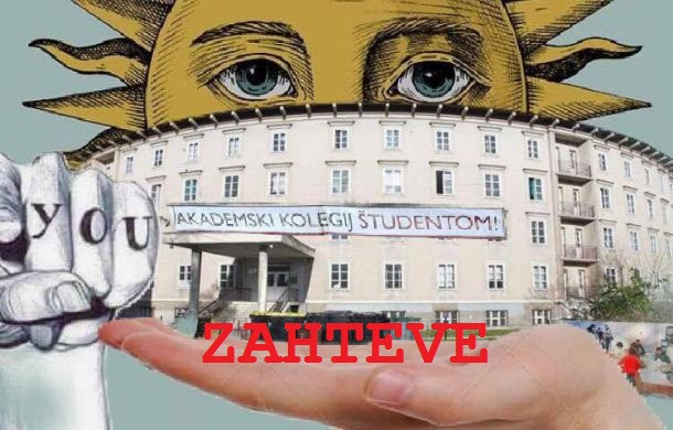 Subvencioniranih nastanitev za študente je v Ljubljani glede na število študentov bistveno premalo. Primanjkljaj je vrhunec dosegel v letošnjem študijskem letu, ko je več sto študentov ostalo brez obljubljenih ležišč. Zaradi prostorske stiske znotraj študentskih domov smo se prisiljeni na predavanja voziti od doma, bivati po hostlih in plačevati turistično takso ali pa se prepustiti nemogočim razmeram na najemnem trgu. Ljubljana, univerzitetno mesto, situacijo zaostruje z zapiranjem Akademskega kolegija, kar pomeni izgubo 203 najdostopnejših študentskih postelj. S tem bo še več tujih in domačih študentov potisnjenih na najemni trg, na katerem bodo pristajali na visoke najemnine, neprimerne pogoje in kratkoročne najemne pogodbe. Poleg študija se nas bo vse več primoranih bojevati s stanovanjskim trgom. Zato zahtevamo: