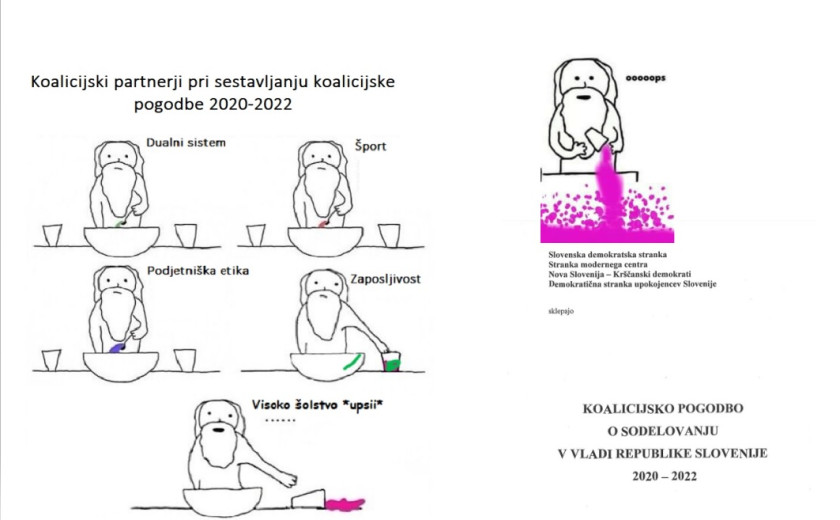 Svojo obljubo je izpolnila in v koalicijsko pogodbo pogledala Eva, vejice je postavljala Irena, tehnicirala pa Raketa. Brala sva Maruša in Muri.
