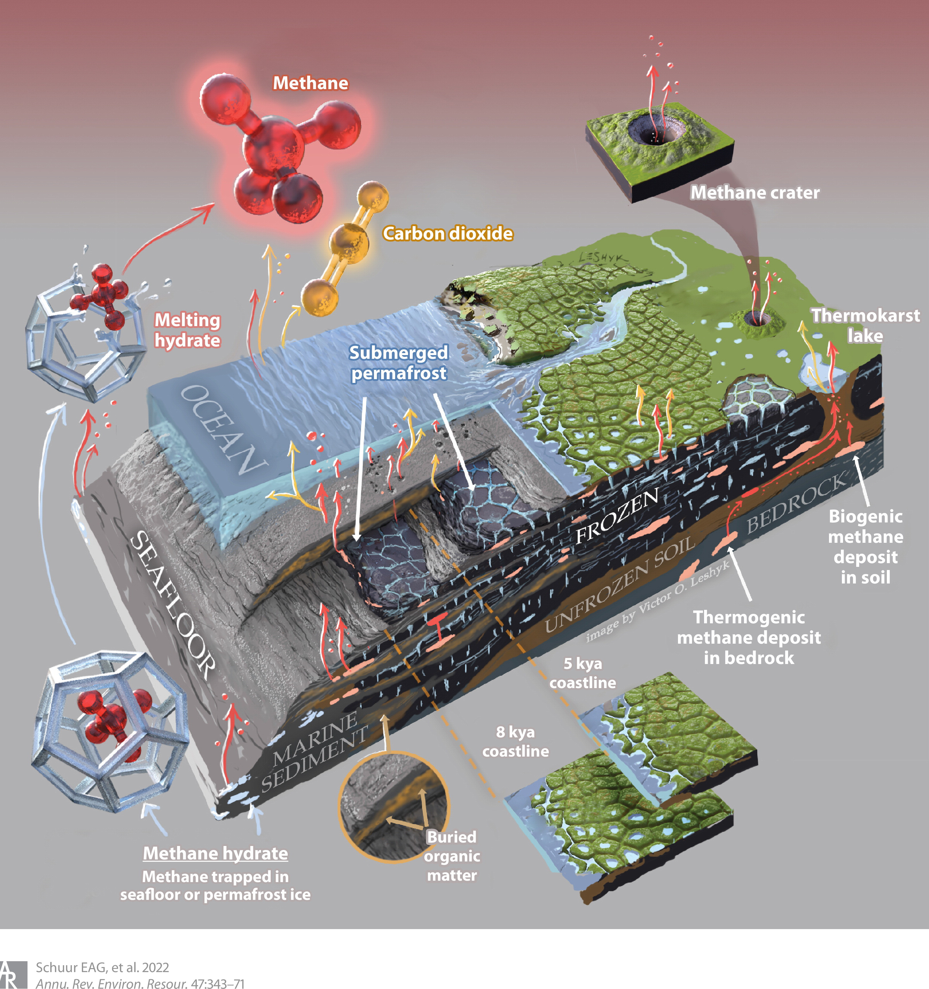 Schuur, E. A., Abbott, B. W., Commane, R., Ernakovich, J., Euskirchen, E., Hugelius, G., ... & Turetsky, M. Permafrost and climate change: Carbon cycle feedbacks from the warming Arctic. Annual Review of Environment and Resources 47, 343-371 (2022). https://doi.org/10.1146/annurev-environ-012220-011847
