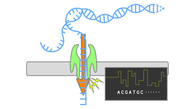 Nukleotidno zaporedje nukleinskih kislin določamo že več desetletij. Ena od sodobnejših tehnologij določanja nukleotidnega zaporedja temelji na nanoporah, majhnih proteinskih luknjicah. Več proteinov se poveže v obroč s poro na sredini, skozi njo pa tečejo ioni, saj je celoten sistem v električnem polju. Pri tej tehnologiji encim, imenovan helikaza, potiska molekulo DNK skozi nanoporo. Molekula DNK deluje kot ovira v pori, zaradi nje se spremeni tok ionov, ki tečejo skozi poro. Tok ionov skozi poro je odvisen od nukleotida, ki se tisti trenutek nahaja v pori – večji ko je nukleotid, bolj ovira tok ionov. Z merjenjem toka ionov je zato mogoče določiti, kateri nukleotid je v določenem trenutku prečkal poro, ti podatki pa nam povedo, kakšno je nukleotidno zaporedje molekule DNK.