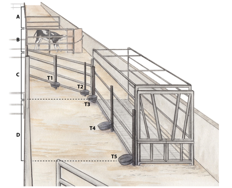 Za raziskavo so izbrali dvajset krav mlekaric. Skupina desetih krav je bila kontrolna – te so v ogrado usmerjali z mirnimi gibi, verbalnim spodbujanjem in po potrebi s trepljanjem.  Drugi deseterici so na poti do ograde nastavili tarče, pri katerih so dobile priboljšek, ko so se jih dotaknile. Tarč je bilo pet in vsaka naslednja je bila bliže ogradi. Ko je krava osvojila trening pri tarči ena, so postopek ponovili pri tarči dve, tri in tako dalje. Vajo so ponavljali štirikrat na teden, sedem tednov zapored. Namen treninga je bil, da krave samostojno sledijo tarčam v ogrado, kjer nato mirno ostanejo eno minuto.